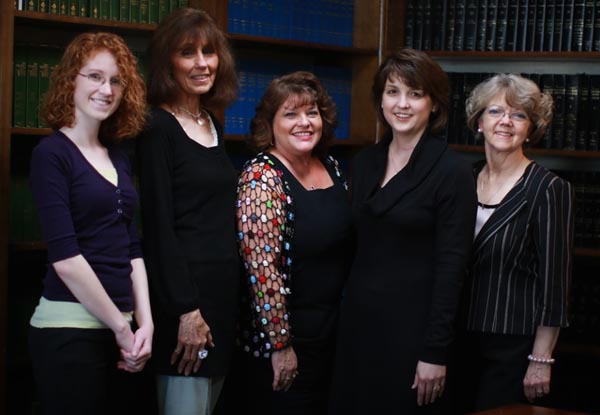 | Pictured below, beginning on the right: Terry Garrett, the first voice you normally hear when you contact our office (1983); Laura Crouch, legal secretary (1987); Susan Decker, legal secretary (1997); Yvonne Townsend, legal secretary and also at the front of the office (1985); and Bailey Thomas, office assistant, the most recent in a long series of college students who have provided support to our staff throughout the many years. | ||